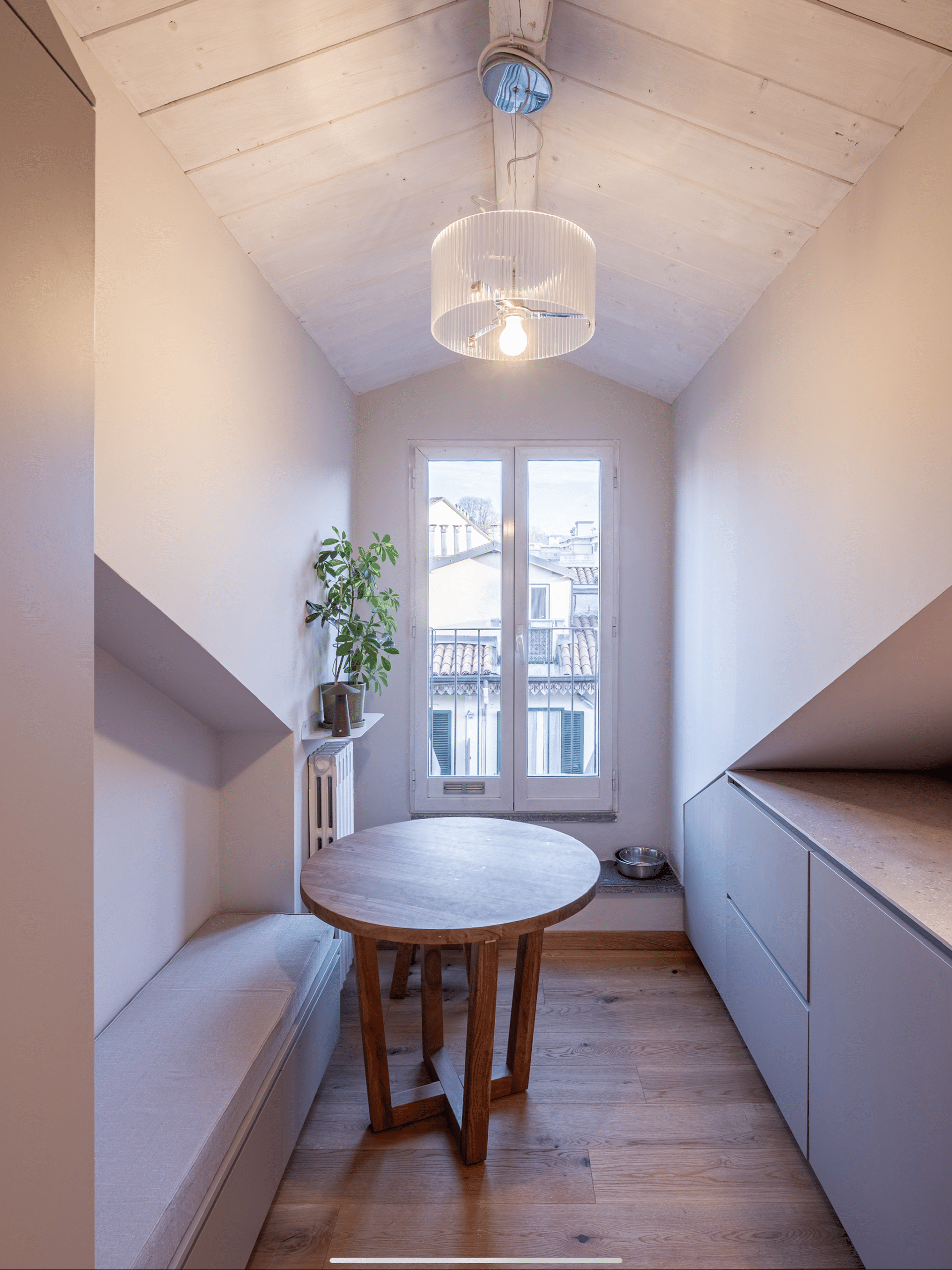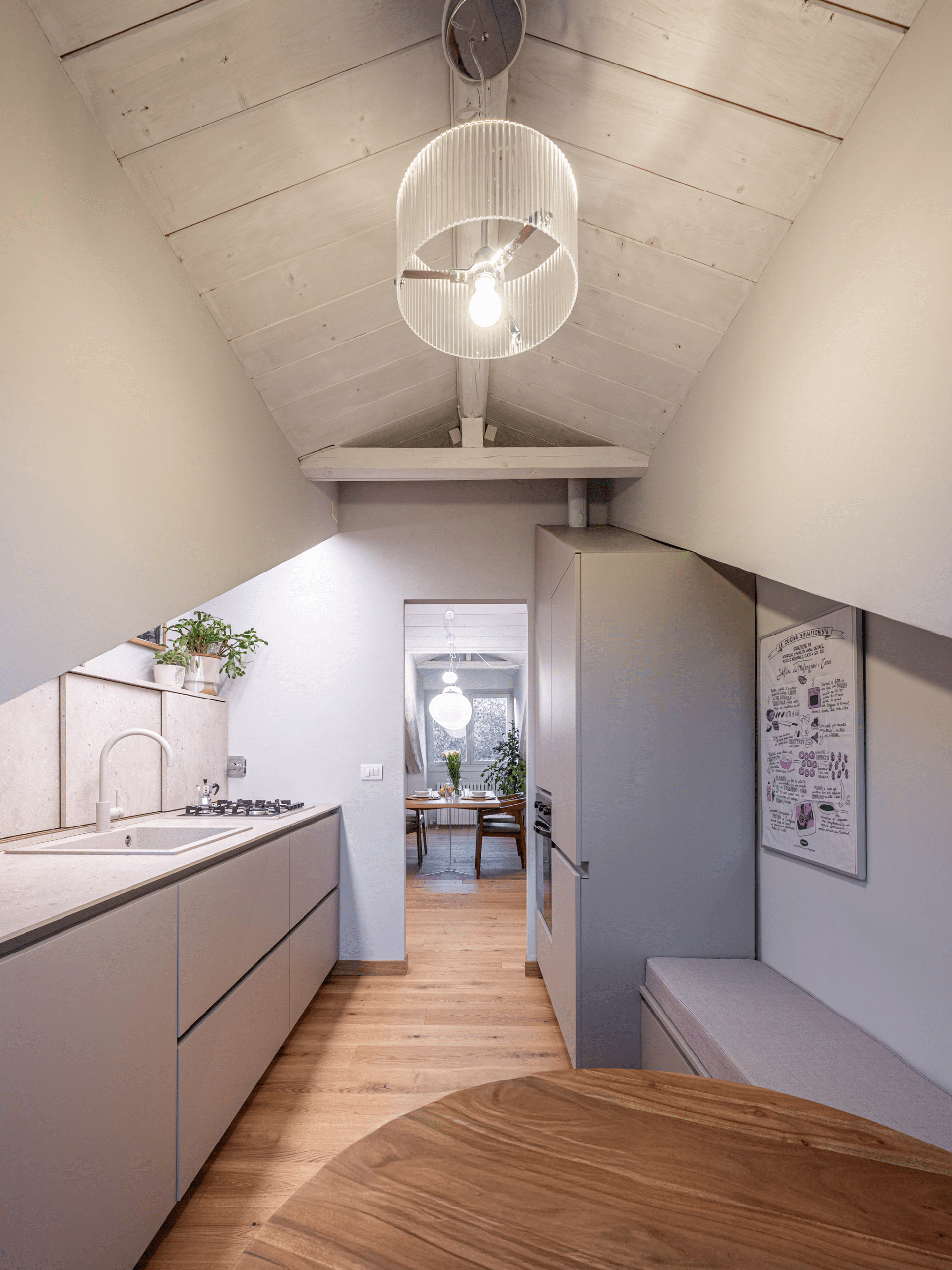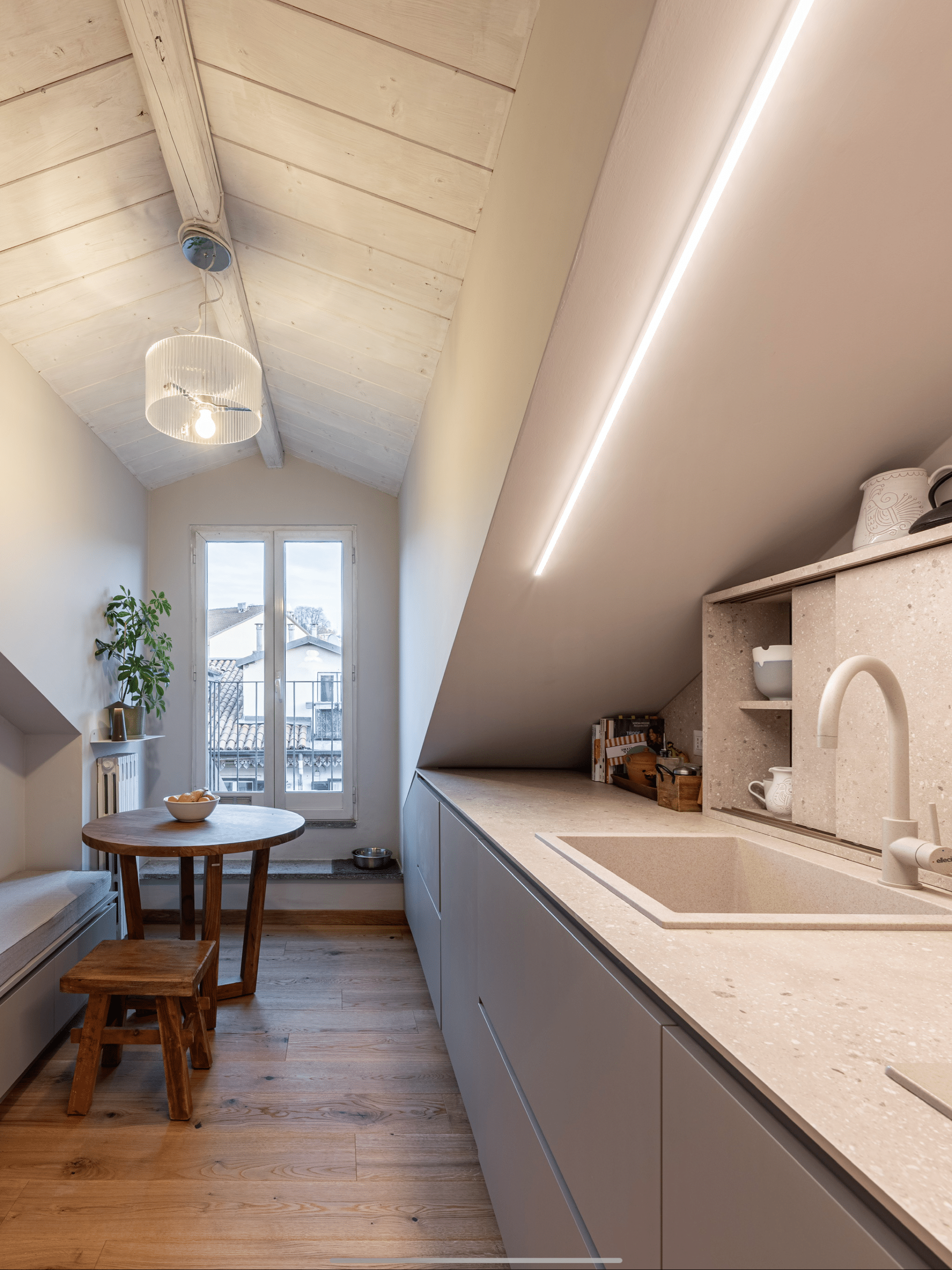 La cucina, sebbene di dimensioni contenute, è stata progettata con grande ingegno: realizzata su misura da falegnameria, sfrutta al meglio le pendenze delle falde, trasformando i vincoli della mansarda in un valore funzionale ed estetico, permettendo di inserire anche un angolo colazione dalla quale si scorge la collina torinese.