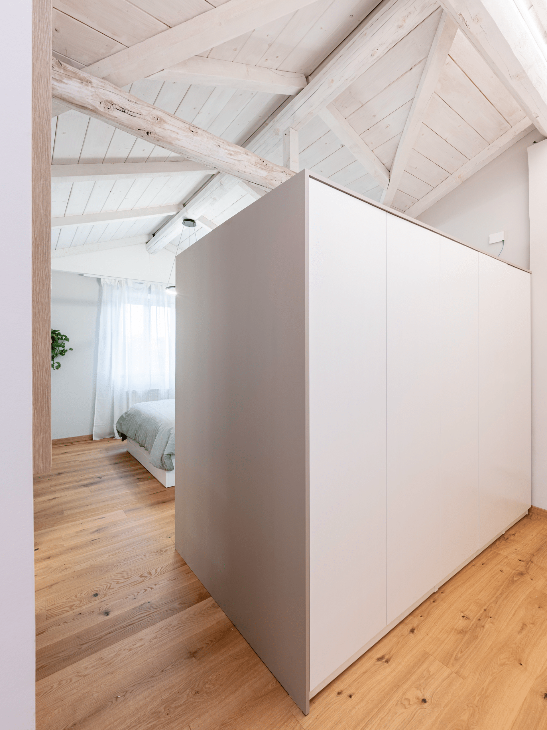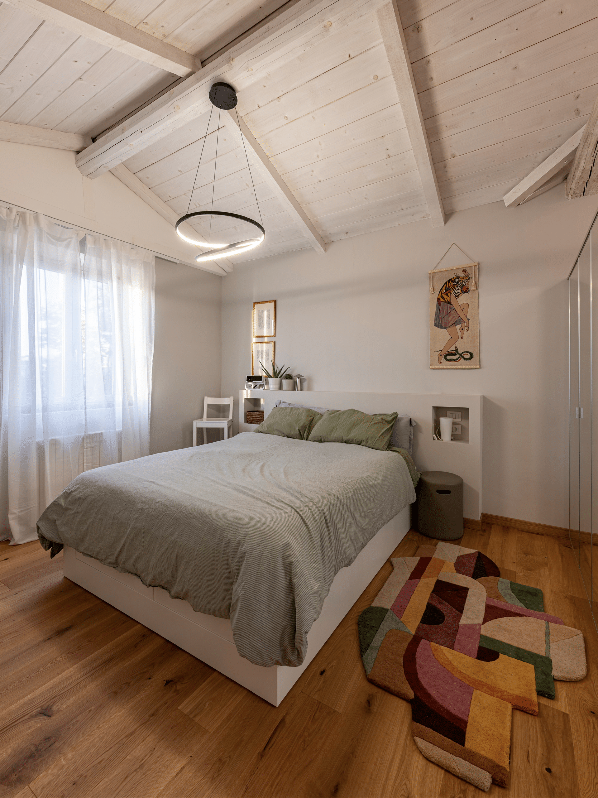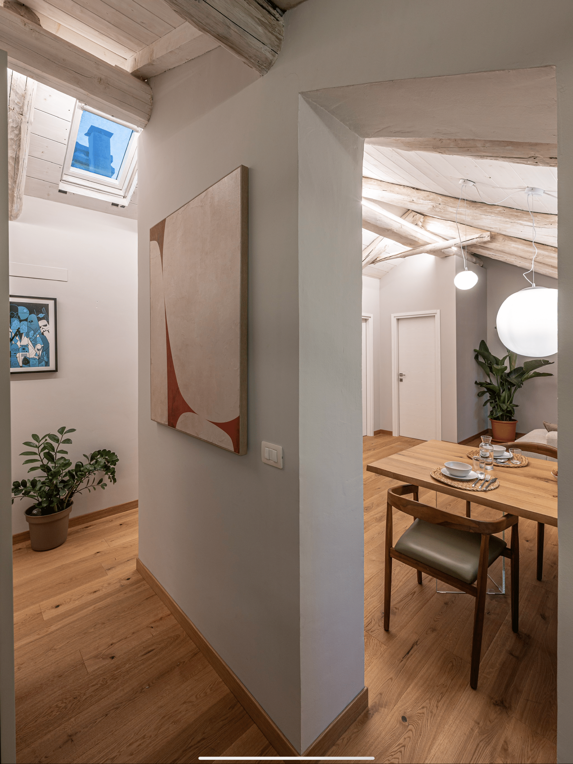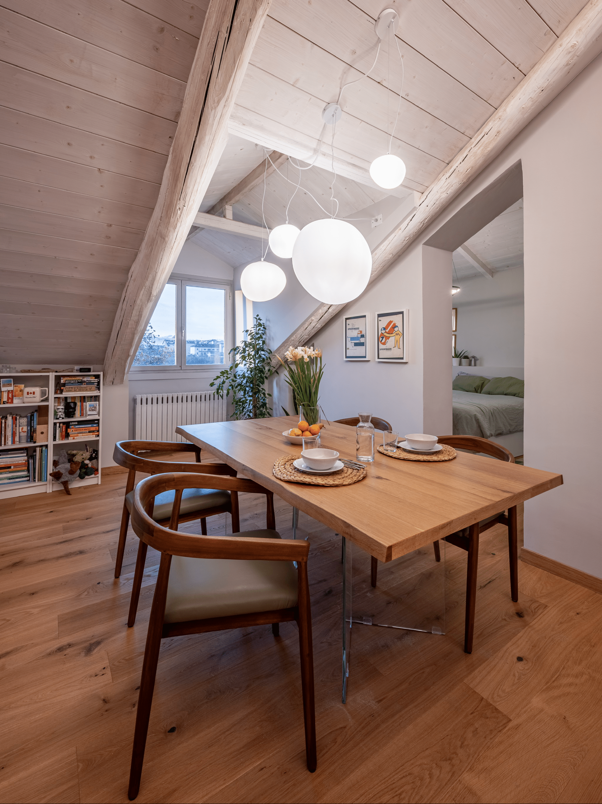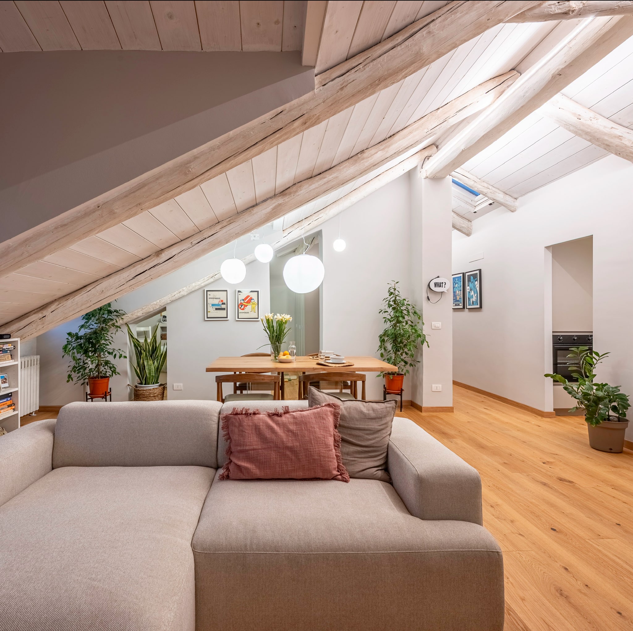 La zona soggiorno e pranzo, ampia e estremamente luminosa, rappresentano il cuore della casa. Qui le travi in legno a vista, filo conduttore dell’intero appartamento, si mostrano in tutta la loro bellezza, contribuendo a creare un’atmosfera calda, accogliente e di grande carattere.