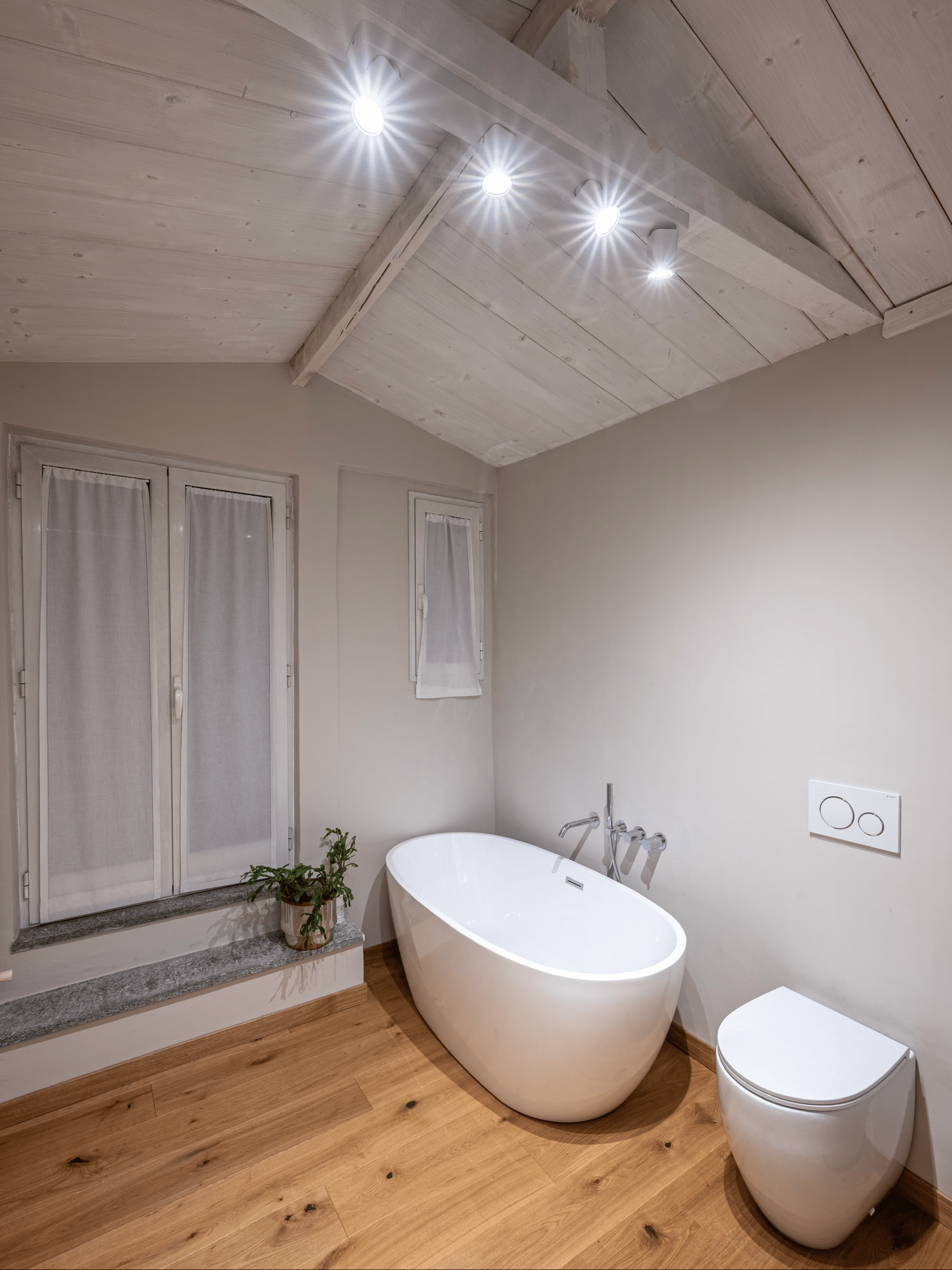 Il bagno, di generose dimensioni, è un vero ambiente di benessere: protagonista una vasca freestanding bianca, dalle forme sinuose, affiancata da una grande doccia. Completa lo spazio un vano lavanderia nascosto, celato da ante su misura, che mantiene ordine e pulizia visiva.
